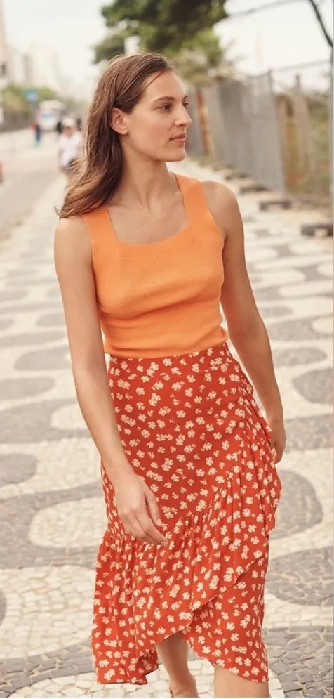 Madewell Ruffle Wrap Midi Skirt Orange White Floral Modest Long Size 4 AO371