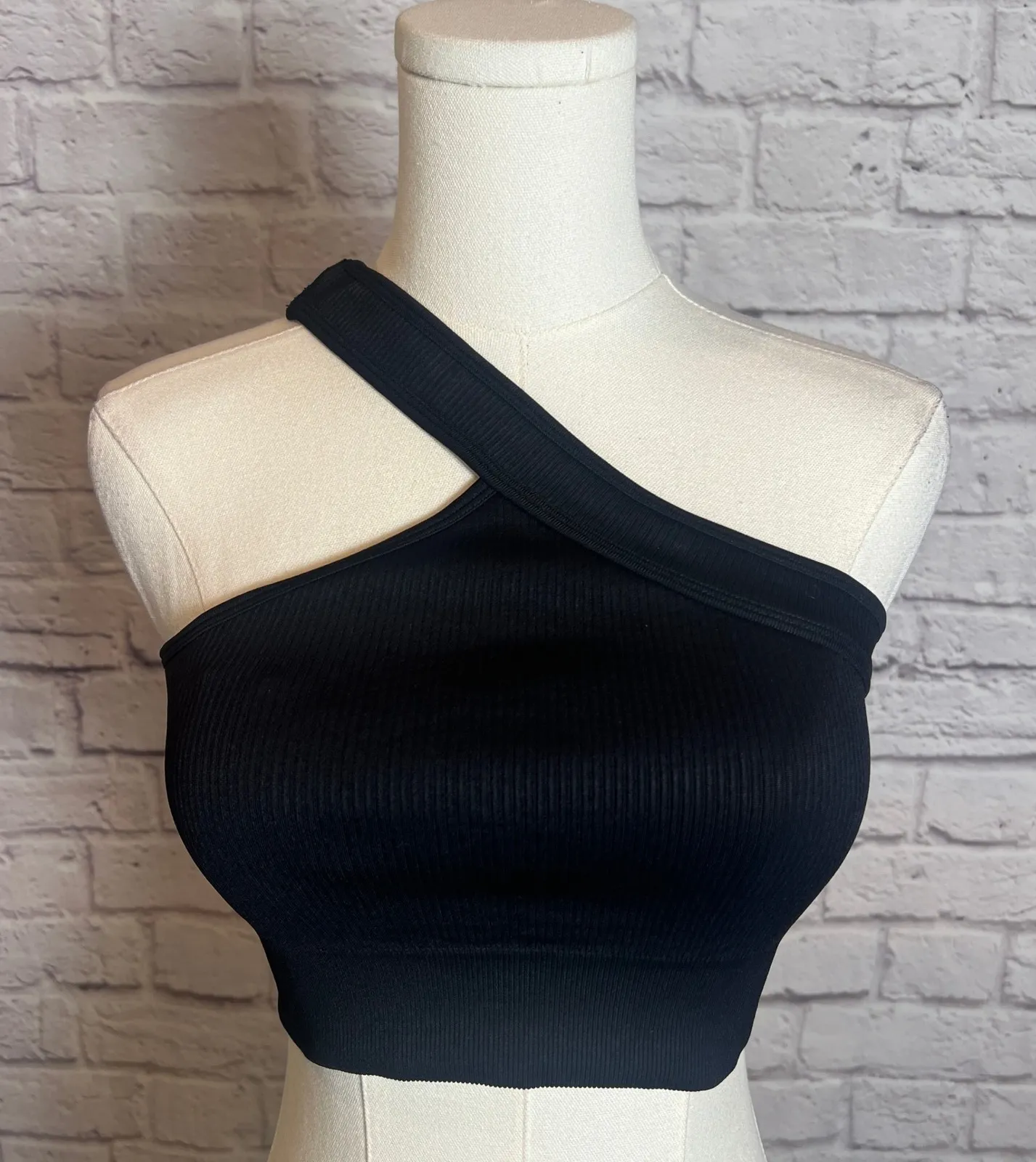 OQQ Women's M Black One Shoulder Ribbed Crop Top Black ribbed knit crop top with asymmetrical one-shoulder neckline. Stretch fabric with fitted silhouette and wide shoulder strap. Fashion top with pullover design. Brand: OQQ Size: Medium Color: Black Material: 90% Nylon, 10% Spandex Style: One-shoulder, cropped Closure: Pullover Condition: NWOT, never worn, no flaws noted Keywords: women's crop top, one shoulder top, black ribbed crop top, asymmetrical top, Y2K top