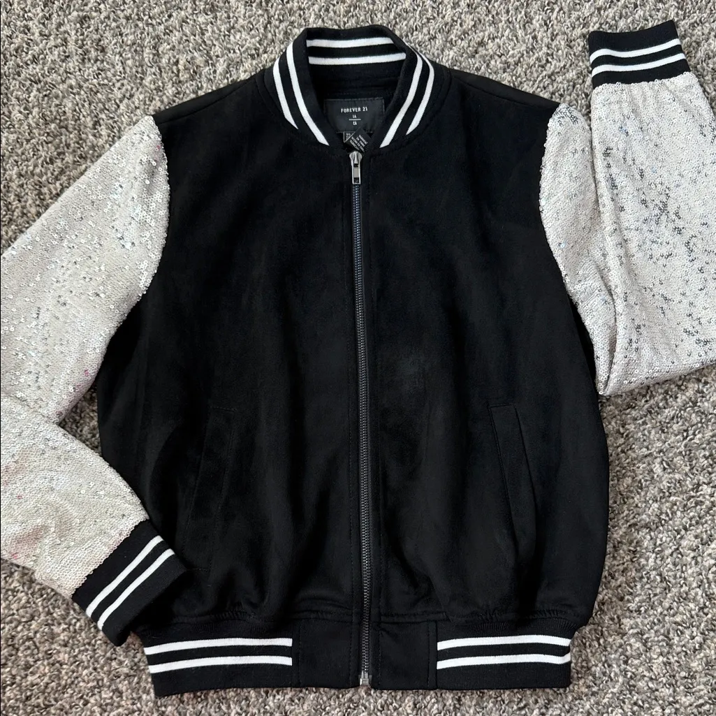 Black with silver sequin sleeves, bomber jacket from Forever 21, size small. RK16