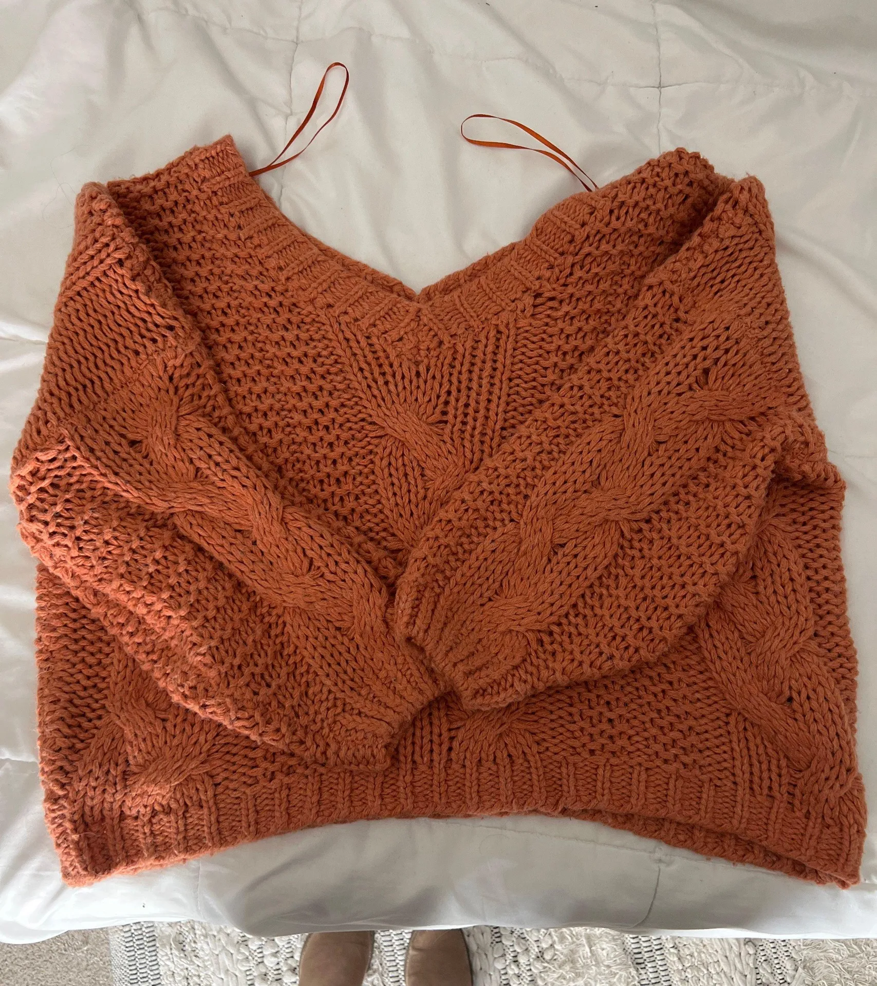 Worn a few times but in perfect condition! Watch the video to see how it can be worn - regular and/or off one or both shoulders! Hopefully the pics/video do the color justice. It’s a pretty fall color orange. Brighter orange than the pics show
