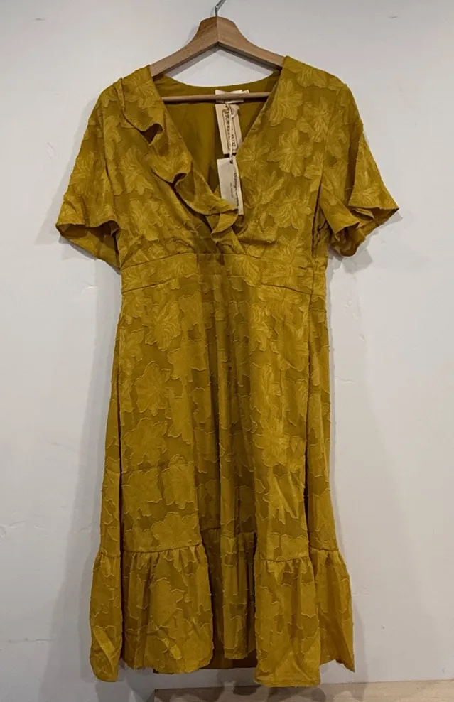 Elegant golden midi dress with floral design. Features ruffled neckline and short sleeves. Ideal for versatile wear. Brand new Orange Creek Golden mustard Floral Midi Dress short sleeve size M