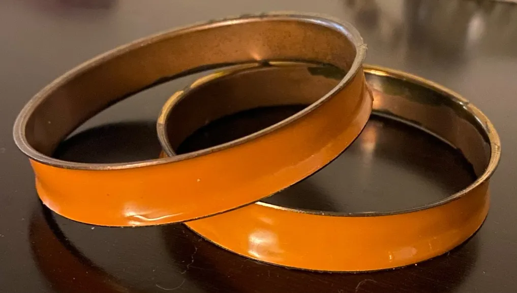Add a bold pop of color to any outfit with this orange enamel metal bangle bracelet set. Featuring a sleek, minimalist design with a glossy orange finish, these bangles are perfect worn stacked together or mixed with your favorite bracelets for an effortless statement look. Lightweight yet sturdy, they slide on easily and pair beautifully with both casual daytime outfits and elevated evening styles. A great accent for boho, retro, or modern wardrobes. Details: • Set of coordinating orange bangles • Glossy enamel over metal • Smooth interior for comfortable wear • Stackable, minimalist design • Fits approx. 8” wrist • Condition: Good (minor surface wear consistent with use) Perfect for adding color to neutrals, summer looks, or festival outfits.