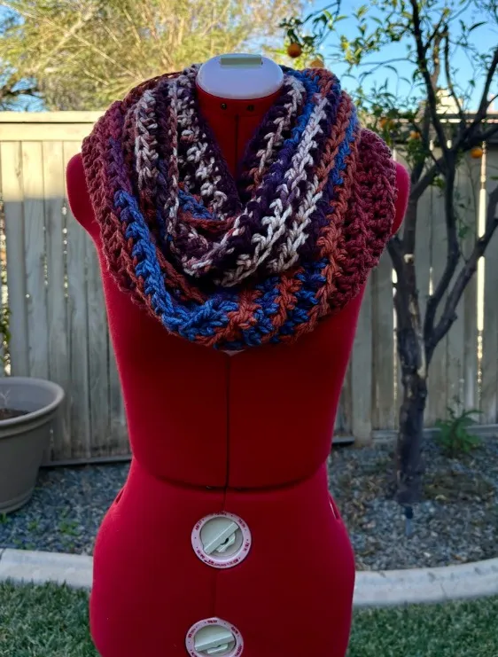 ✨Open to most offers! Request to bundle if you like any of my other items✨ - handmade - crochet infinity scarf - multicolor (blue, orange, burgundy, beige) - lightly used, still in great condition - soft and stretchy - measures about 64" around and 10" wide Items come from a smoke free home :)