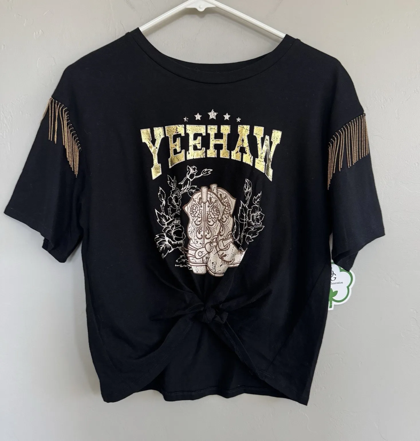 New with tags! Organic Generation Woman’s size medium short sleeve tshirt Black with gold “YEEHAW”, stars, cowboy boots, rose decal Gold tassel accents on sleeves Crop top, front knot detail 100% cotton Designed in Los Angeles Pit to pit: 19”