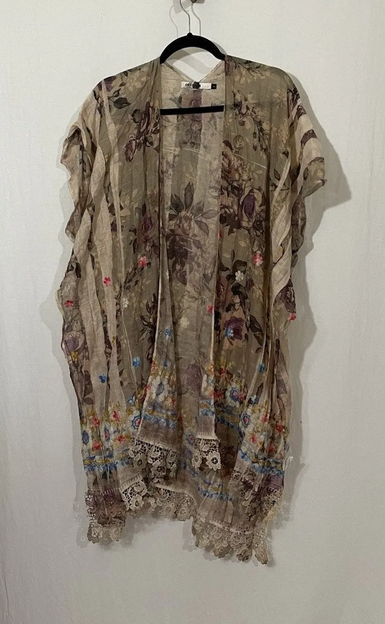 The ORIGAMI cardigan is a vintage-inspired piece with a bohemian style, perfect for those who love lace and unique patterns. Made from lightweight lace fabric, this cardigan features 3/4 sleeves One size fits most. The beige color adds a touch of elegance, making it a versatile piece that can be dressed up or down for any occasion. With its kimono duster design and brand name Origami, this cardigan is sure to make a statement in any woman's wardrobe.