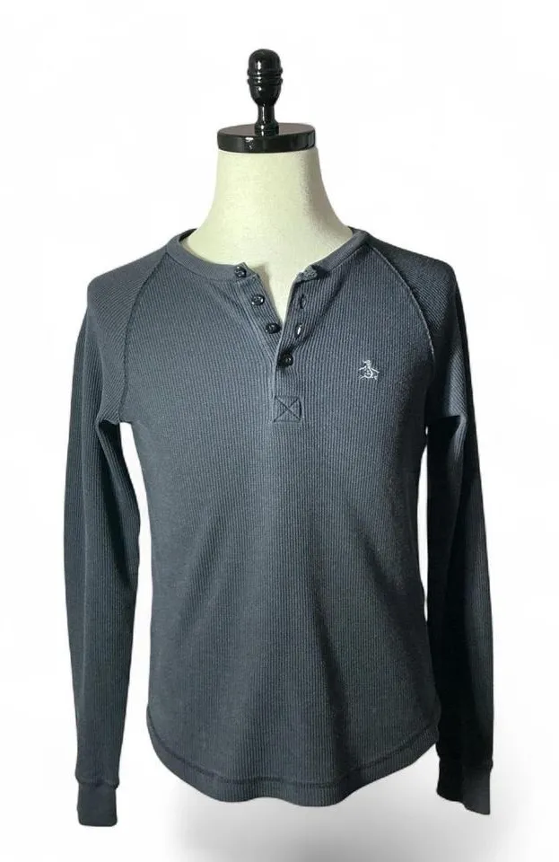 Original Penguin Munsingwear charcoal gray long sleeve henley shirt. Ribbed knit texture and a button-up placket with three buttons. Features a small embroidered penguin logo on the chest. Perfect for casual wear or layering. Stained on sleeve Keywords: penguin henley, thermal shirt, long sleeve, casual top, basic tee, layering piece, button up, ribbed knit, embroidered logo #Cozy