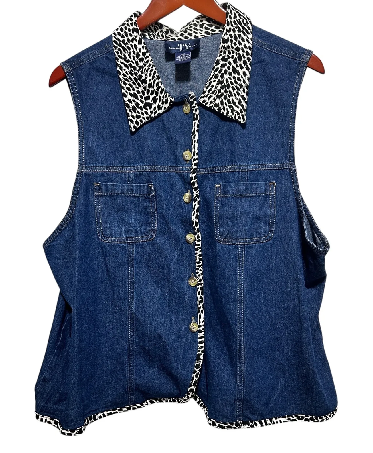 Original TY Wear Womens Button Top 2X Blue Chambray Leopard Trim Y2K Western Great Pre-Owned Condition - See Pictures for Details Features: • Original TY Wear women's plus size denim vest with bold leopard print trim • Features sleeveless cut, button front, and dual chest pockets • 100% cotton denim, comfortable and breathable for layering • Size 2X, great fit for plus size styling • Pair with boots, maxi skirts, or wide-leg jeans for a Y2K western vibe • Ideal for festivals, concerts, retro parties, or casual everyday wear Style Profile: Y2K, retro western, boho festival, casual chic, 90s grunge, indie sleaze, cowgirl core Approximate Measurements: flat lay: armpit to armpit: 25" length: 25" Pet/smoke free home 1-2 day shipping Bundle & Save