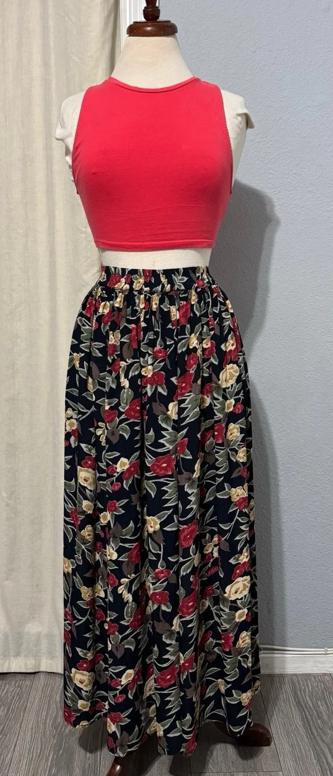 Orvis Floral Maxi Skirt XL Cottage Bohemian Artsy Peasant Granny Crinkle Dark Black - $39 - From Iris