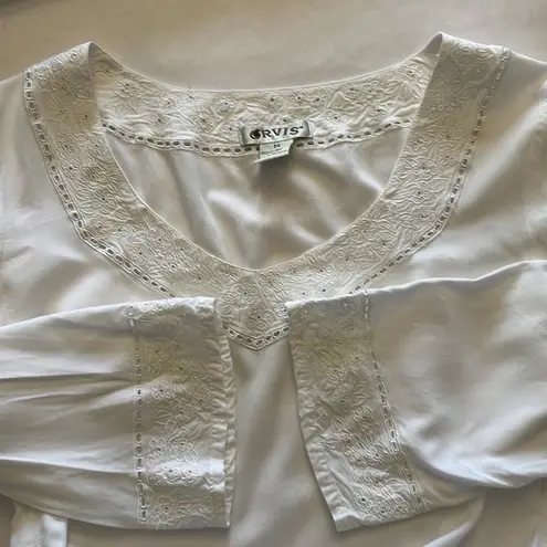 This is the perfect pure white crop top for those stifling hot summer days. A Bohemian vibe with the embroidered eyelet on the V neck and sleeve cuffs. Feminine and luxurious. Measures: Chest 18.5” Cropped hem 20” Length 20” 100% Rayon/ Viscose