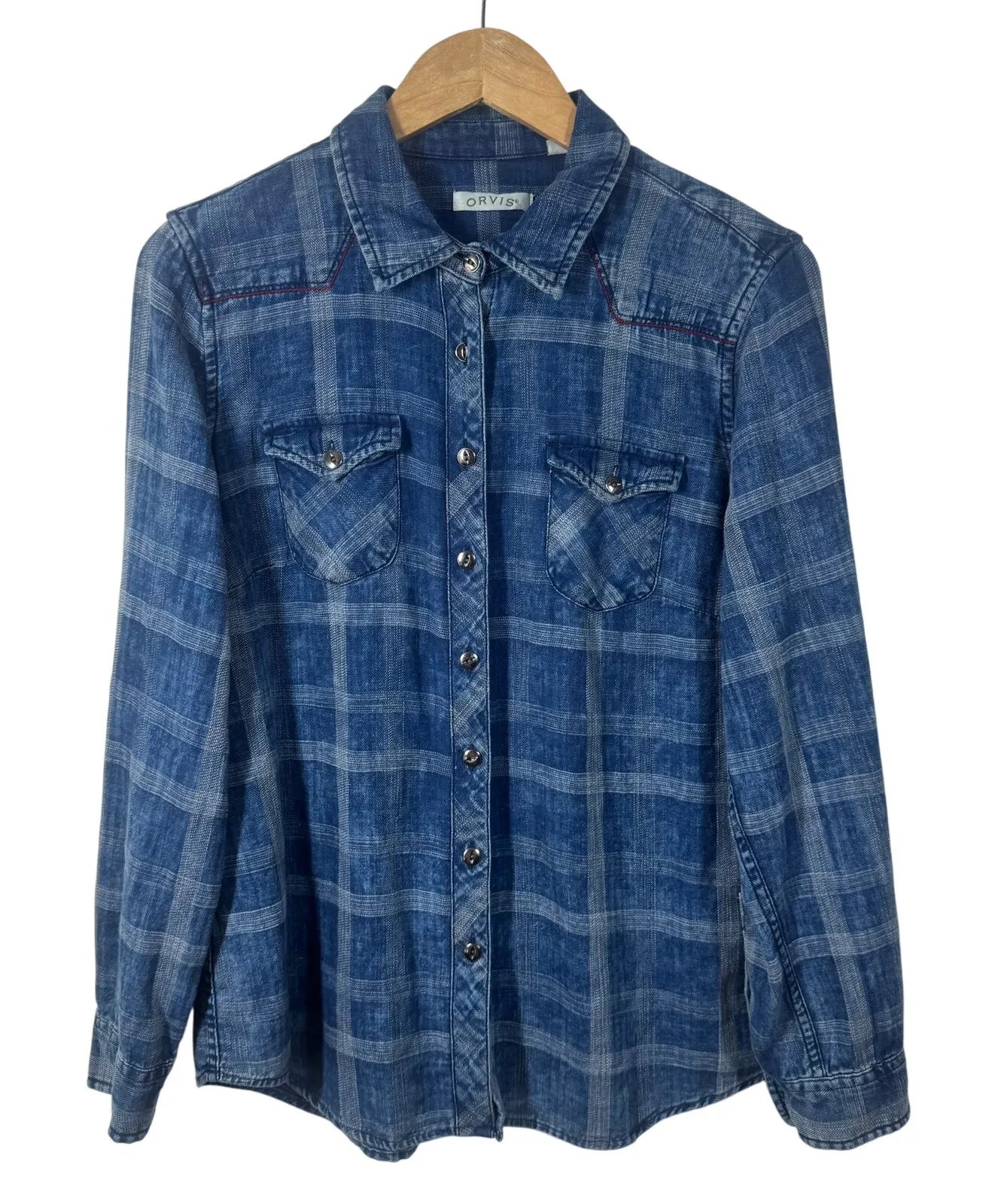 Orvis Shirt Women Size M Blue Plaid Metal Button Up Western Roll Tab Country Size M - $28 - From Hannah