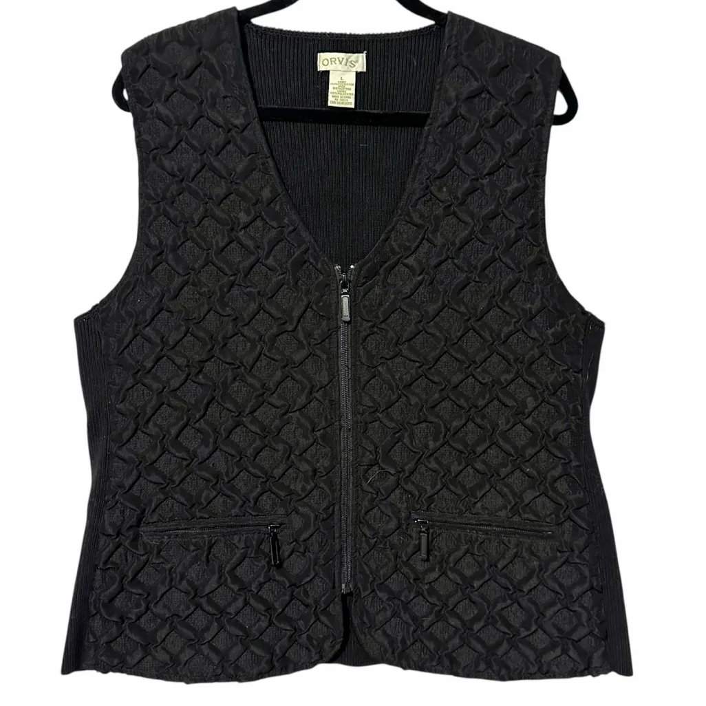 Orvis Woman’s Black Quilted Full Zip Lightweight Vest Size Large Outdoor Hiking. Great condition see photos for details. Front is a quilted polyester and back is a cotton ribbed sweater material. Super comfy. Approximate measurements 24.5” shoulder to hem and 21” pit to pit. Has some stretch/give across back.