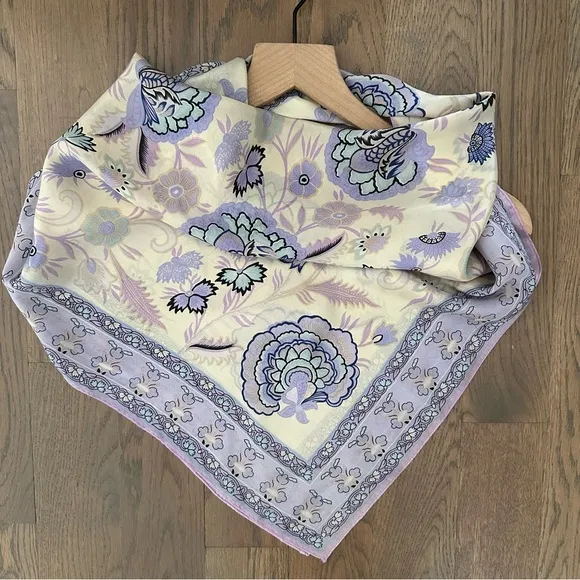 Oscar de la Renta floral and paisley silk scarf. In cream, lavender, pale blue, periwinkle, and black. Gorgeous floral botanical print with paisley pattern throughout. Hand rolled, hand stitched edges. Measures 31" by 30". A gorgeous floral and paisley print. Stunning designer preppy glam piece in soft pastel tones. Minor wear, pictured. In good used condition. No trades; bundle discount available.