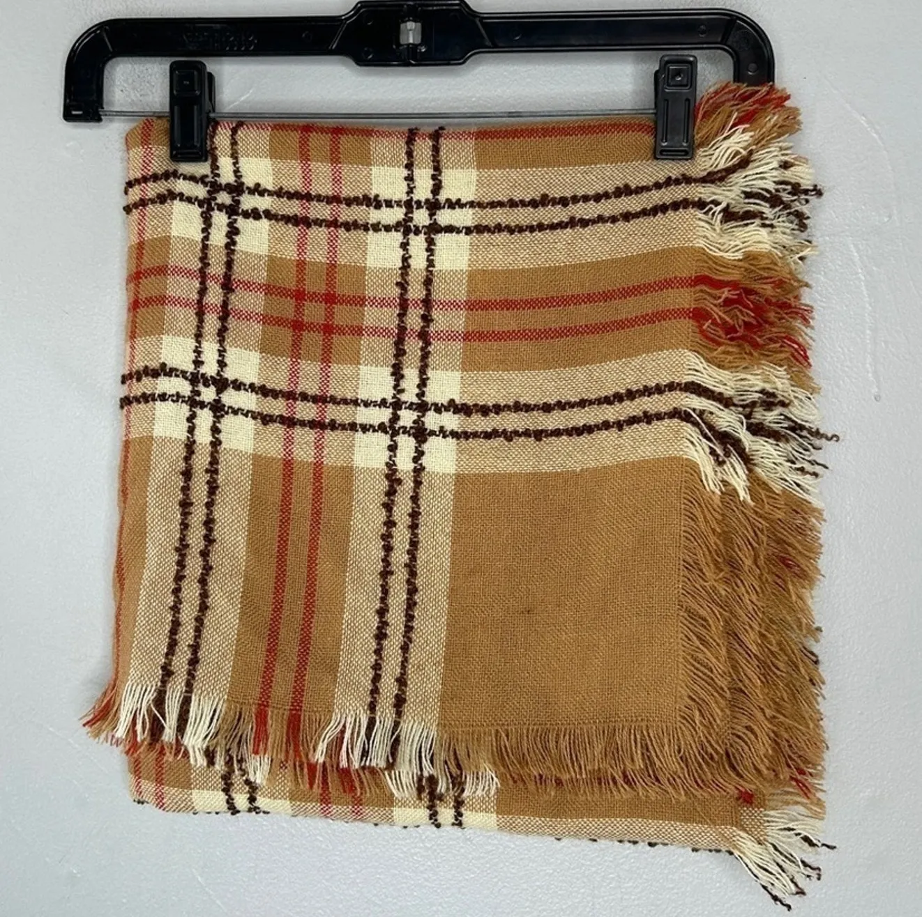 OSCAR DE LA RENTA for Accessory Street Vintage Knit Scarf Wrap Tartan Plaid Large Fringe Japan Autumn Beautiful VTG tartan plaid large scarf, shawl, or wrap in off-white, cream, tan, brown, and red colors. Perfect autumn vibes. Knit fabric with fringe on edges. It is very large and could also be used as a small blanket! No stains or holes. Mark on cover photo is not a stain, it is the color of a darker fabric knit into it in only that one small spot. 51” x 51” Made in Japan 100% Acrylic Fall, Winter, Warm, Cozy, Classic, Classy, Closet Staple,