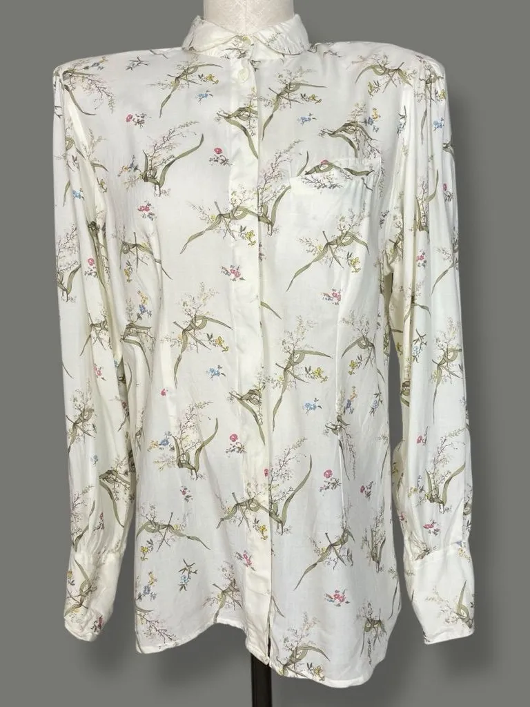 Vintage 90s Outback Red women's off-white/cream colored blouse with long sleeves, hidden buttons up the front, and rounded collar. 100% Rayon. Thick shoulder pads - could be carefully snipped out. Condition: Gently preloved, no holes or stains. Size: Small. See approximate measurements for best fit. Pit to pit: 20" Length: 28" Cleaned and from a smoke-free home. Fast shipper!