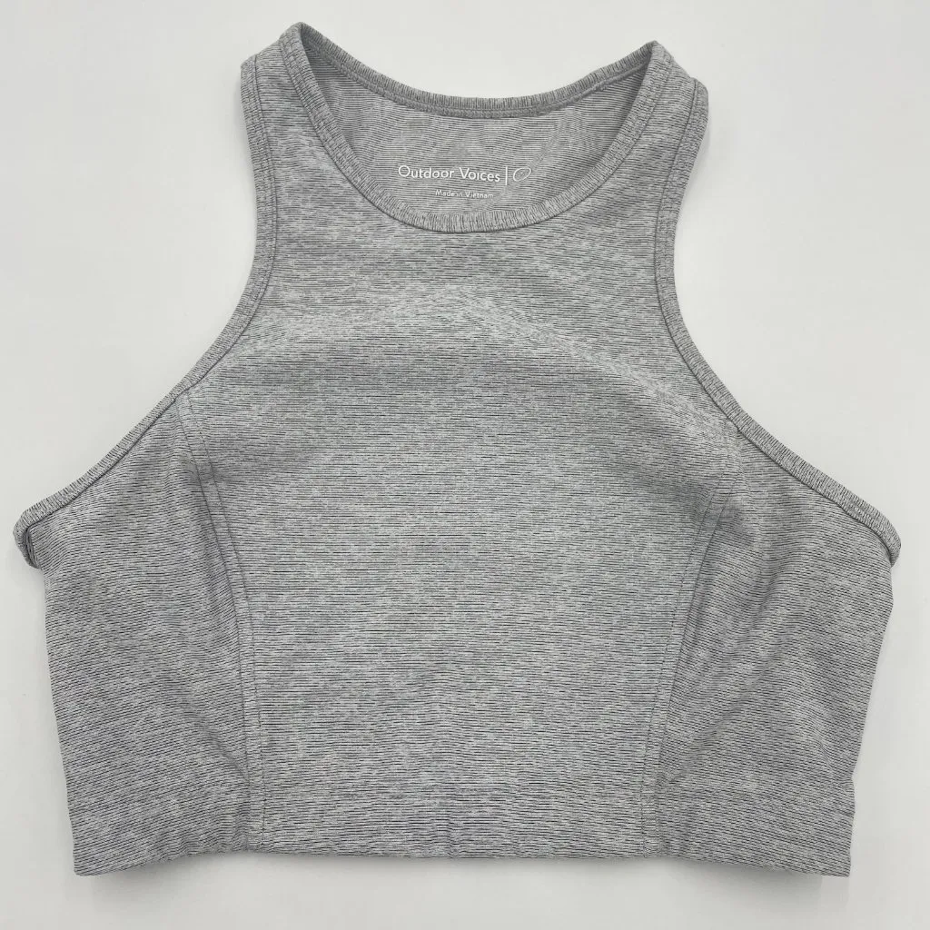 Outdoor Voices women's heather gray racerback sports bra. 86% Polyester, 14% Spandex. Condition: Ge... Show more