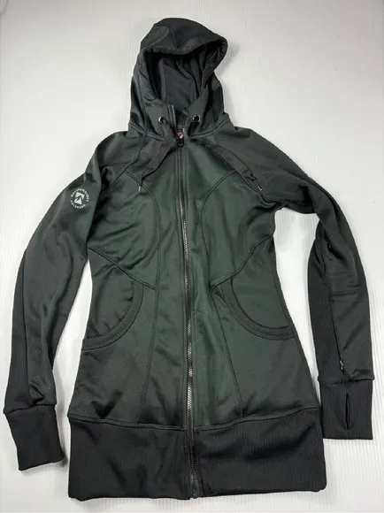 Stylish and functional athleisure jacket, perfect for workouts or casual wear. This full-zip hoodie features a comfortable hood with adjustable drawstrings, thumb holes for added warmth and convenience, and a flattering silhouette. The jacket also includes practical details like front pockets and a logo on the sleeve. Measurements: * Pit to pit: 21 inches * Length: 27 inches. Ideal for jogging, yoga, or running errands around town. Jacket/Coat Length: Long Lining Material: Polyester Blend Color: Black Style: Track Jacket Department: Women Outer Shell Material: Polyester Type: Jacket Performance/Activity: Running & Jogging, Gym & Training, Yoga, Hiking, Athleisure Closure: Zip Features: Thumbholes, Pockets, Breathable, Lightweight Keywords: Breckenridge Colorado, hoodie, jacket, full zip, athletic, athleisure, thumb holes, women's jacket, workout jacket, running jacket, black hoodie, casual jacket, outdoor jacket