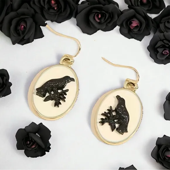 Oval Gold Plated Crow Dangle Halloween Earrings Retro Style Zinc Alloy & Plastic - $13 New With Tags - From Mon