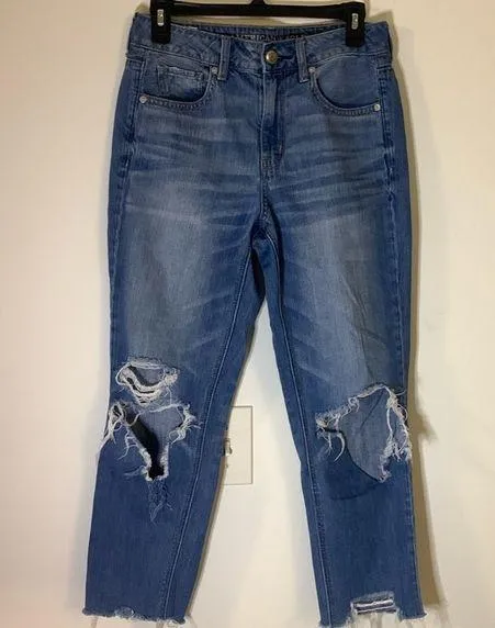 Size 4 Long Great used condition 100% cotton Distressing, knee rips, fading Raw hem Inseam =25” Of... Show more
