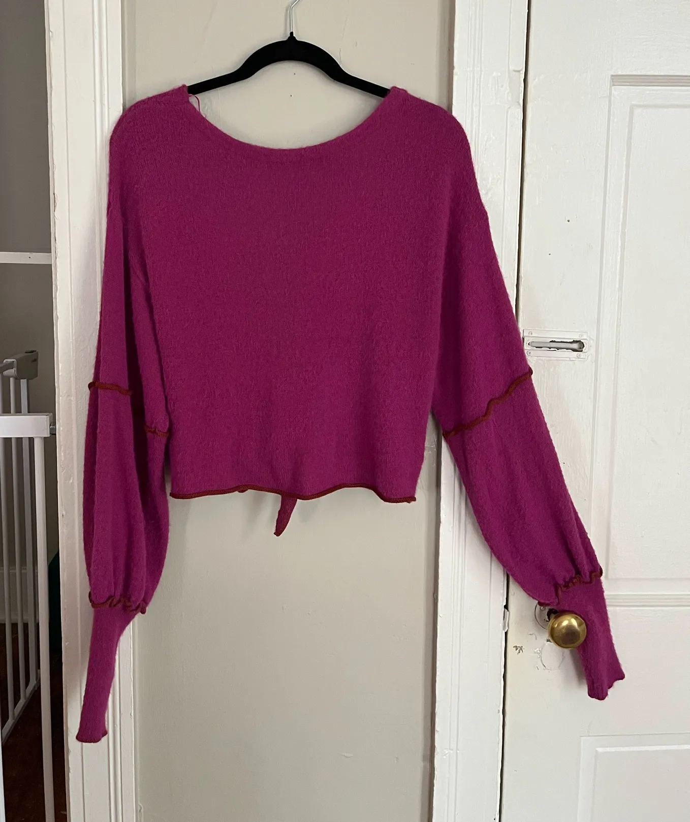 Open back and ties at the bottom. Super cozy Minor wear