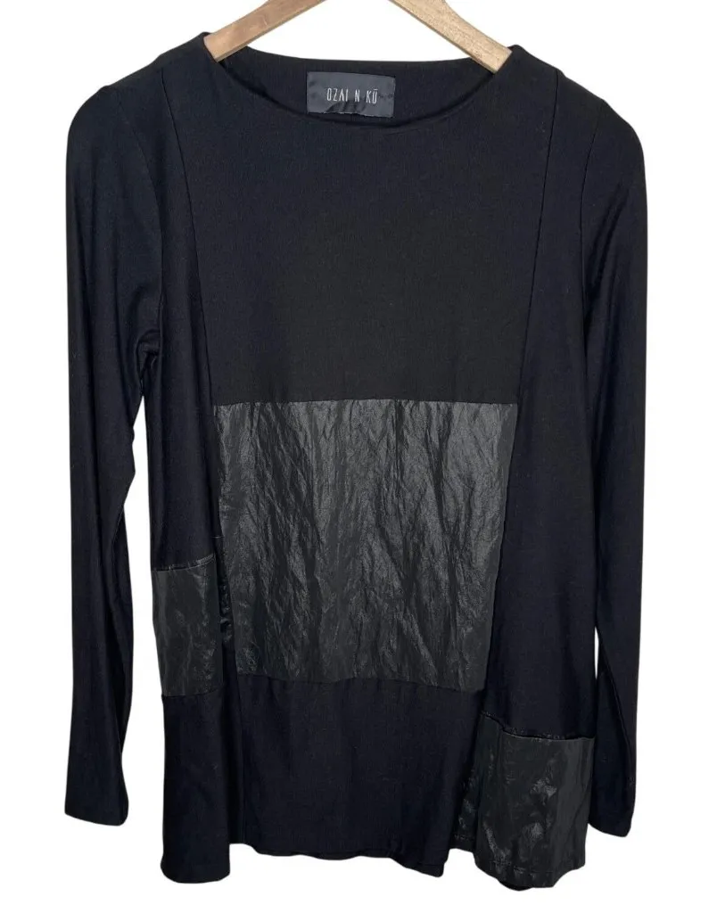 Excellent preloved condition Ozai N Ku Black Lagenlook Long Sleeve Faux Leather Tunic Top Size Small... Show more
