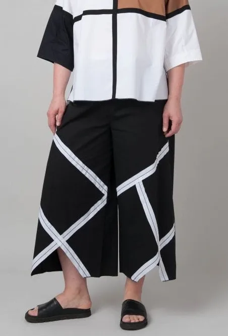 OZAI N KU Wide Leg Cut Out Asymmetric Black White Ribbon Pants Elastic Zip Waist Striking pair of Ozai N Ku wide-leg cropped pants featuring bold white contrast ribbon appliqué stitched into an abstract geometric pattern. Designed with the brand’s signature architectural style, these pants have a dramatic asymmetric cutout hem that creates sharp angles and visual movement. Crafted from a structured cotton blend, they offer a relaxed, modern silhouette with easy pull-on comfort. Features: • Black cotton-blend fabric • White stitched ribbon appliqué (geometric) • Wide-leg cropped silhouette • Asymmetric cutout hem • Modern, artsy, architectural design • Pull-on style (elastic/comfortable waist) • High-quality construction Perfect statement pants for styling with minimalist tops, flowy tunics, or sandals. 2683