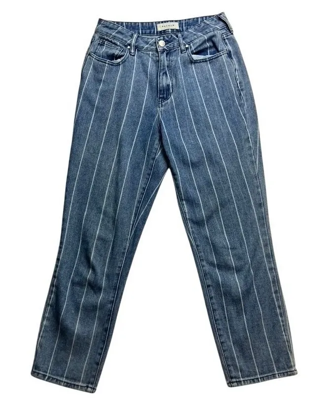 Measurements: • Waist: 26 in • Inseam: 24.5 in • Rise: 11 in Style: Mom Department: Women Fabric Wash: Light Waist Size: 26 in Type: Jeans Features: Pockets Pattern: Striped Fabric Type: Denim Material: Cotton Closure: Zip, Button Pocket Type: 5-Pocket Design Garment Care: Machine Washable Country of Origin: China Unit Type: Unit Keywords: P A C S U N jeans, striped denim, high rise, casual, streetwear, distressed, vintage wash, straight leg, fashion, trendy, petite Ships fast from a smoke and pet free home.