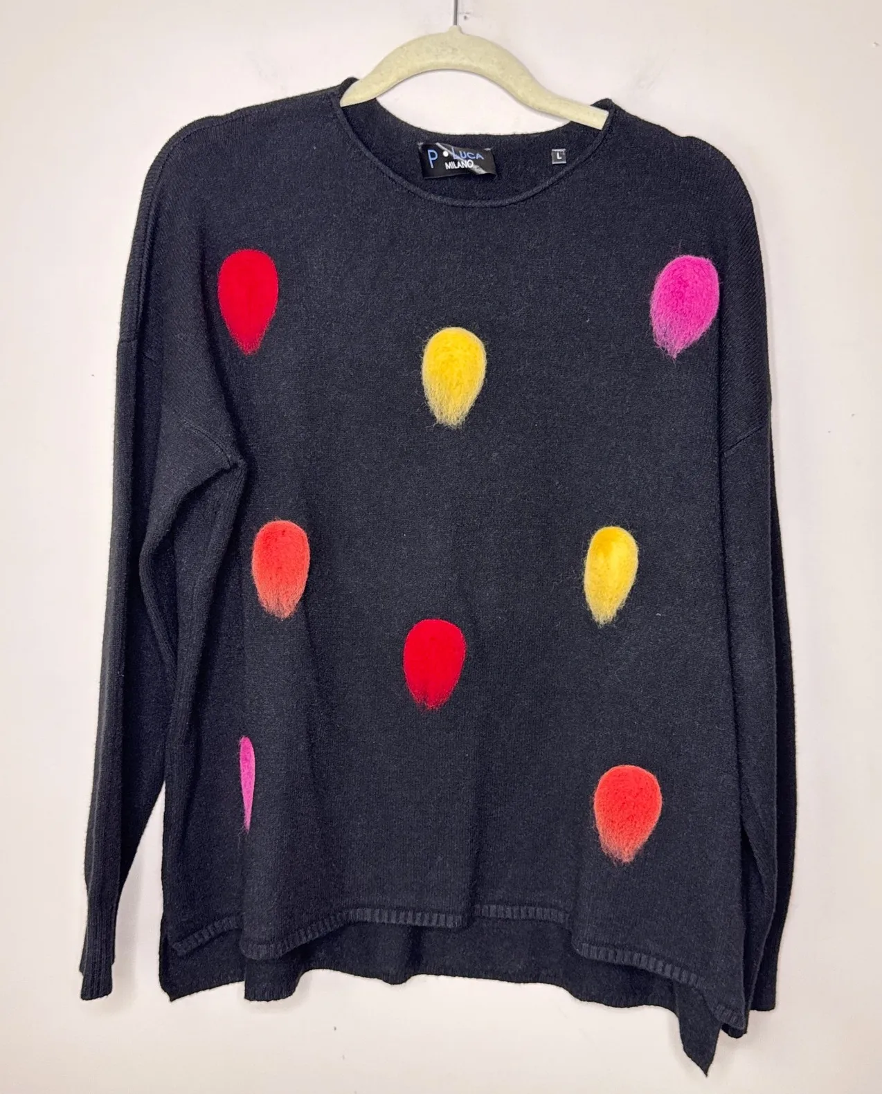 P. Luca Milano Sweater Size: Large Style: Pullover Color: Black Department: Women Type: Sweater Material: Viscose, Nylon, Polyester Sleeve Length: Long Sleeve Neckline: Crew Neck Features: Circle Print, Knit, Casual, Comfortable, Contemporary Pattern: Solid Fabric Type: Knit Keywords: P. Luca Milano, Black Sweater, Balloon Print, Knit Sweater, Women's Sweater, Crewneck Sweater, Long Sleeve, Viscose Blend, Casual Sweater, Comfortable Sweater, Designer Sweater, Modern Sweater, Unique Sweater APPROX. MEASUREMENTS: *Measurements are taken with the item lying flat. Pit to pit: 25" Shoulder to hem: 25" front 27" back * open to reasonable offers * ships next business day * pet-free and smoke-free home * all items washed, unless dry clean only or hand wash label. Please, wash to wear. * see pictures for details. Colors can vary on different devices.