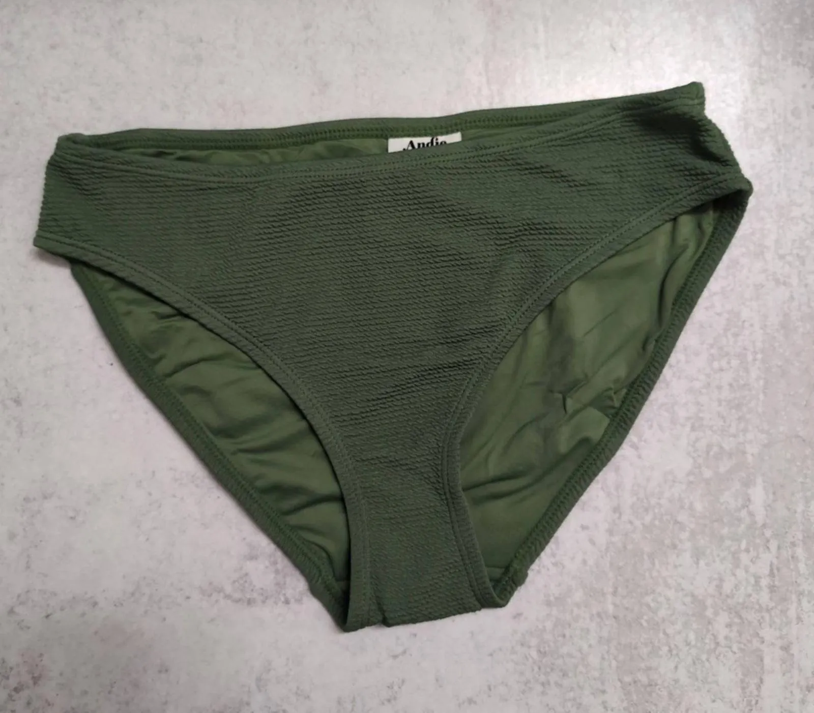 Andie Bikini Bottom Seagrass Green Textured Mid-Rise Size M Dive into summer style with these NWT Andie Seagrass Green bikini bottoms. The unique textured crinkle fabric and mid-rise cut offer both comfort and a flattering look for your next beach day. Condition: New with Tags (NWT) condition. Size: Medium Features: Olive Green, Textured Crinkle Fabric, Mid-Rise Cut, Polyester Spandex Blend, Lined, Swimwear Brand: Andie Type: Bikini Bottom Style: Swimwear Beachwear Color: Olive Green Material: Shell: 96% Polyester 4% Spandex, Lining: 90% Nylon 10% Spandex Keywords: Summer, Beachwear, Poolside, Vacation, Resortwear, Women, Chic, Coastal, Earthy, Swimsuit