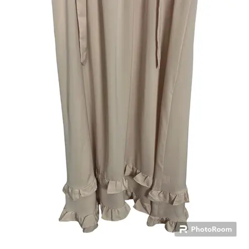 Women's ruffle maxi dress in beige. 1/4 button. V-neck. Self neck tie. Ruffle short sleeves. Ruffle hem. Lined. In good used condition. No stains, tears or holes. 100% polyester.