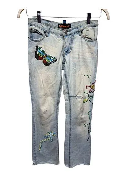 Size 1/2 Cotton Light wash, low rise, boot cut Embroidered colorful beaded butterfly and floral des... Show more