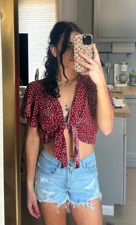 Shorts are size small, comes as a set or willing to sell separately! Trendy burgundy polka dot blous... Show more
