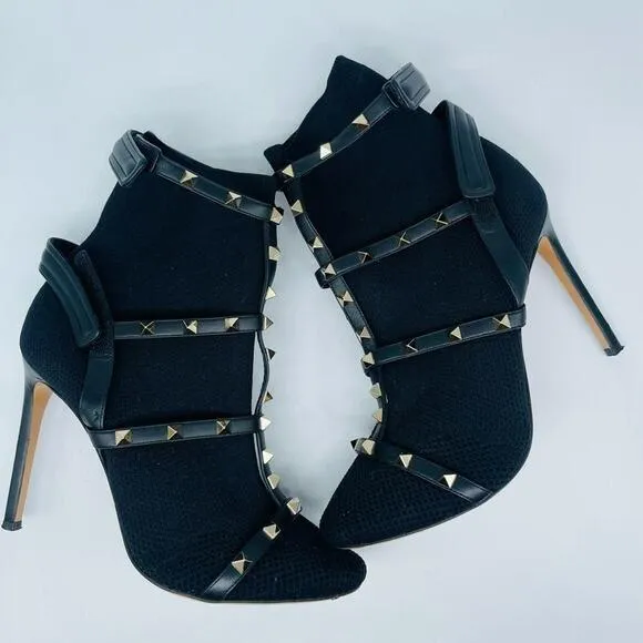 Excellent preowned condition Signs of wear include wear on soles, insoles are very clean comes with open box only no dustbag Almond toe ~4” heels Stretch knitted booties detailed with tonal leather straps, platinum finish metal studs, two adjustable Velcro straps, covered stiletto heel, and leather sole.