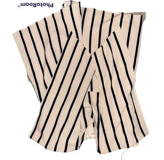 Size large. But fits like medium Black strips with white on the edges Tan/beige V cut front Were it ties in front Lining inside Very good quality material Stretchy Bought at local clothing boutique