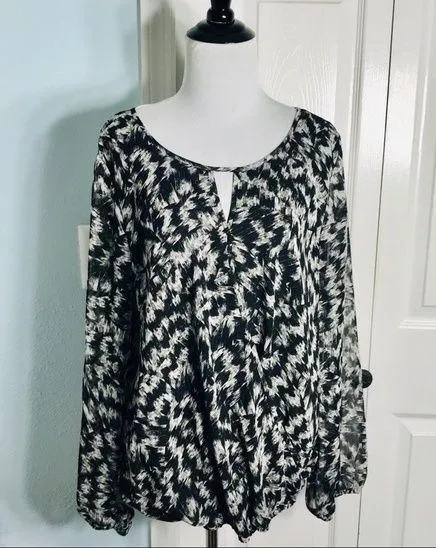 Gorgeous Vince Camuto Long Sleeve Faux Wrap Top with sexy Keyhole Detail. Black and white modern abs... Show more