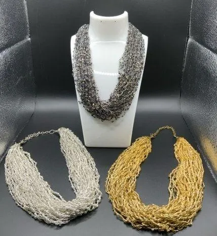 Trio of multi-strand necklaces in gold, silver and black Each necklace is multi strand with each str... Show more