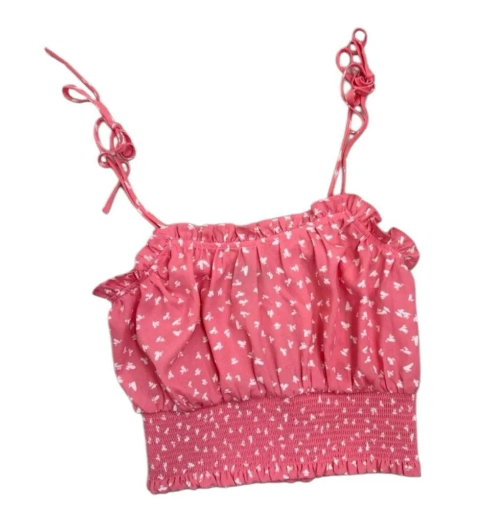 Womens Spaghetti Strap Crop Top Pink White Ruffled Smocked Adjustable Tie Playful Summer Condition:... Show more