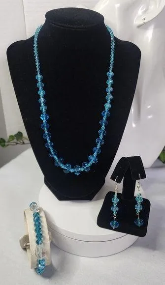 Set of matching jewelry, including a necklace, stretch bracelet, and hook earrings. Handcrafted with aqua marine faceted cut crystal rondelle beads. Necklace measures 20 inches with a magnetic clasp. Hardware is made of silver stainless steel. All pieces are included in the set. Only one set available. @449e Handmade crystal blue casual dressy work office fashion staple everyday simple style layer stack