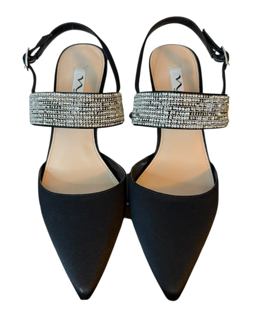 Brand new in box never worn. Gorgeous black satin pointed toe slingback heels with jeweled strap. So beautiful and a great pair of heels to have for any formal event! WOMENS size 9.