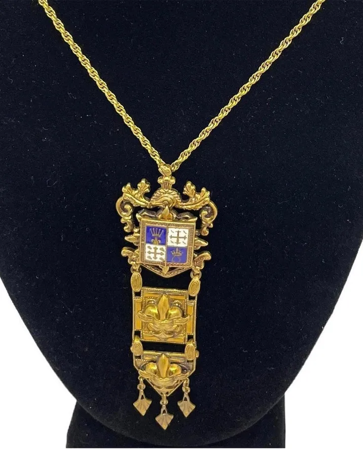 40s Crown Insignia Enamel Pendant Brooch Pendant dangles from original chain but has a brooch pin and clasp in the back for the optional to wear as a brooch. Pendant is divided into three sections. All sections have wonderful craftsmanship with detailed engraving throughout. Top section of pendant has elaborate royal designs and flourishes with the center being a square with color block blue and white enamel. Gold crowns and crosses are surrounded by the color enamel. The second section focal point is an elaborate fleur de lis sitting in square and surrounded with elaborate detailing. The three section is a smaller fleur de lis with 3 triangular charms dangling from it. Sections are connected by oval charms with engraved swirls to connect them. Pendant/brooch comes with the original chain. Chain is a stunning twisted rope design (one photo shows design). This fabulous statement necklace was created in the late 40s It is not signed, but the detail design and construction communicate that this was from a high quality designer. Appropriate Measurements Laid Flat: Pendant total length: 3 1/2” Pendant greatest width: 1 1/4” Chain Length: 17” Condition is good. Back of pendant has some scratches and a little tarnishing in the back. I love how you can wear it this fabulous vintage jewelry piece as a pendant necklace or as a brooch.