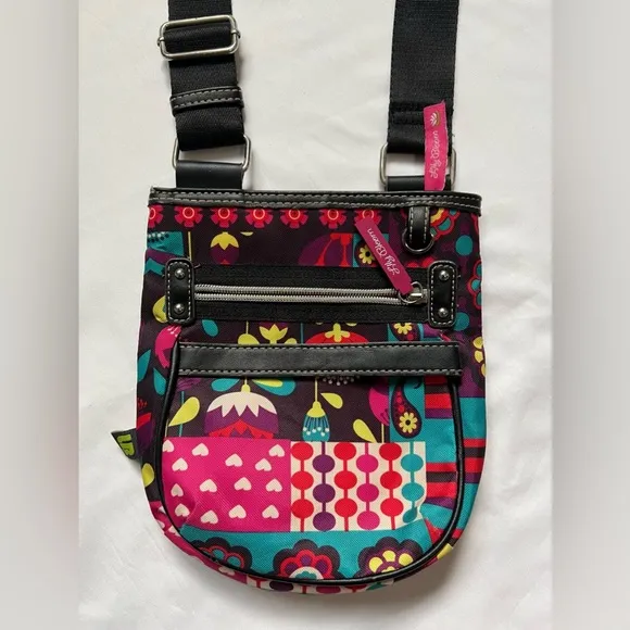 Lily Bloom Canvas Crossbody Purse Bag Colorful Flower Power Colorful Retro Print Features: Long adjustable strap Zippered compartment outside front Open pouch back Logo Zipper Pulls Fully lined (hot pink) Zippered pocket inside Logo tab Note: Excellent previously owned condition; like new! Ships promptly from smoke free and pet free home