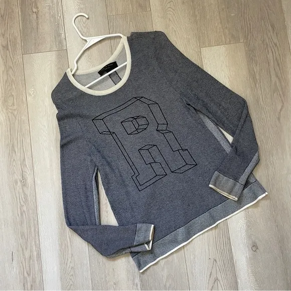Rag & Bone Letter R Sweater in the color heather blue with contrast trim detailing in the color Crea... Show more