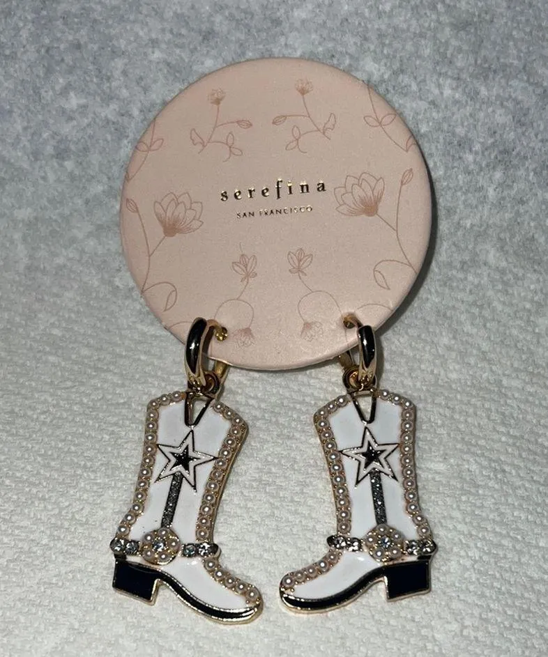 Yee-Haw!! Super cute for that country concert or just a night out on the town!!! Cowboy boot earrings in white and black. Features star detail and rhinestone accents. #SummerVibes #CountryConcerts #Cowboyboots #Earrings #Ontrend