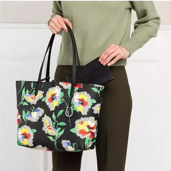 NEW Lauren Ralph Lauren Large Reversible Tote Bag Black/Floral Pouch Handbag Purse Retail $178 Hand... Show more