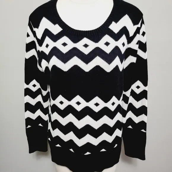 A soft and cozy sweater that will pair nicely with your jeans. G.H. Bass black geo chevron stripe crewneck sweater. Size xl thick knit crewneck long sleeves 60% cotton 40% acrylic