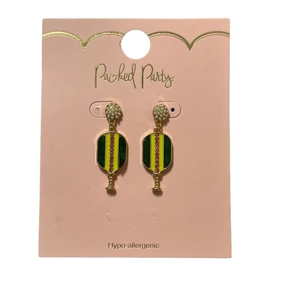 Packed Party Earrings Pickle ball Dangle Pickleball Gold Tone Enamel 1.75" New - $12 New With Tags - From Christy