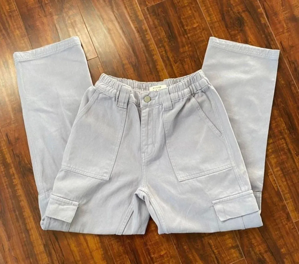 Like a lavender color 🤍 No flaws at all Fits like 24-27, I am 26 and fits me great