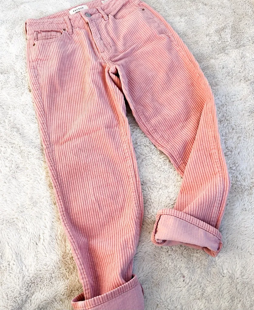 Pacsun Mom Jeans pink corduroy in size 23. 100% cotton. Has one small spot of wear near rise but oth... Show more