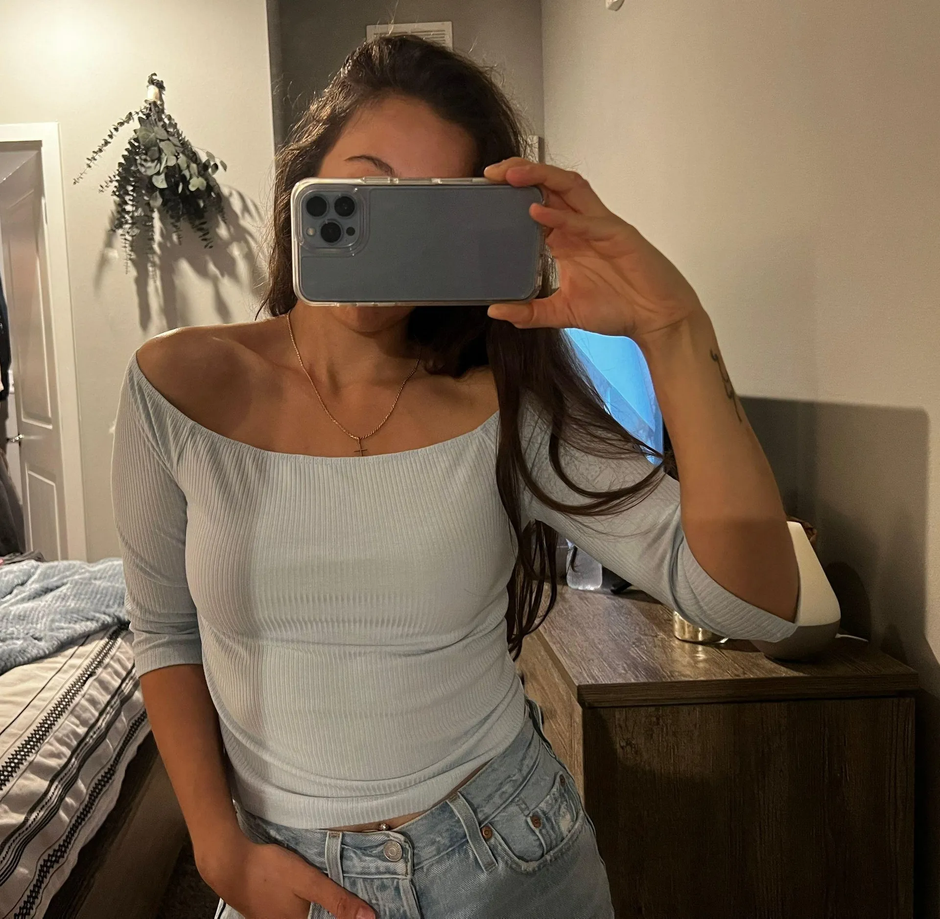Adorable baby blue off the shoulder top! It’s in great condition, no rips or stains! Size M but I’m... Show more