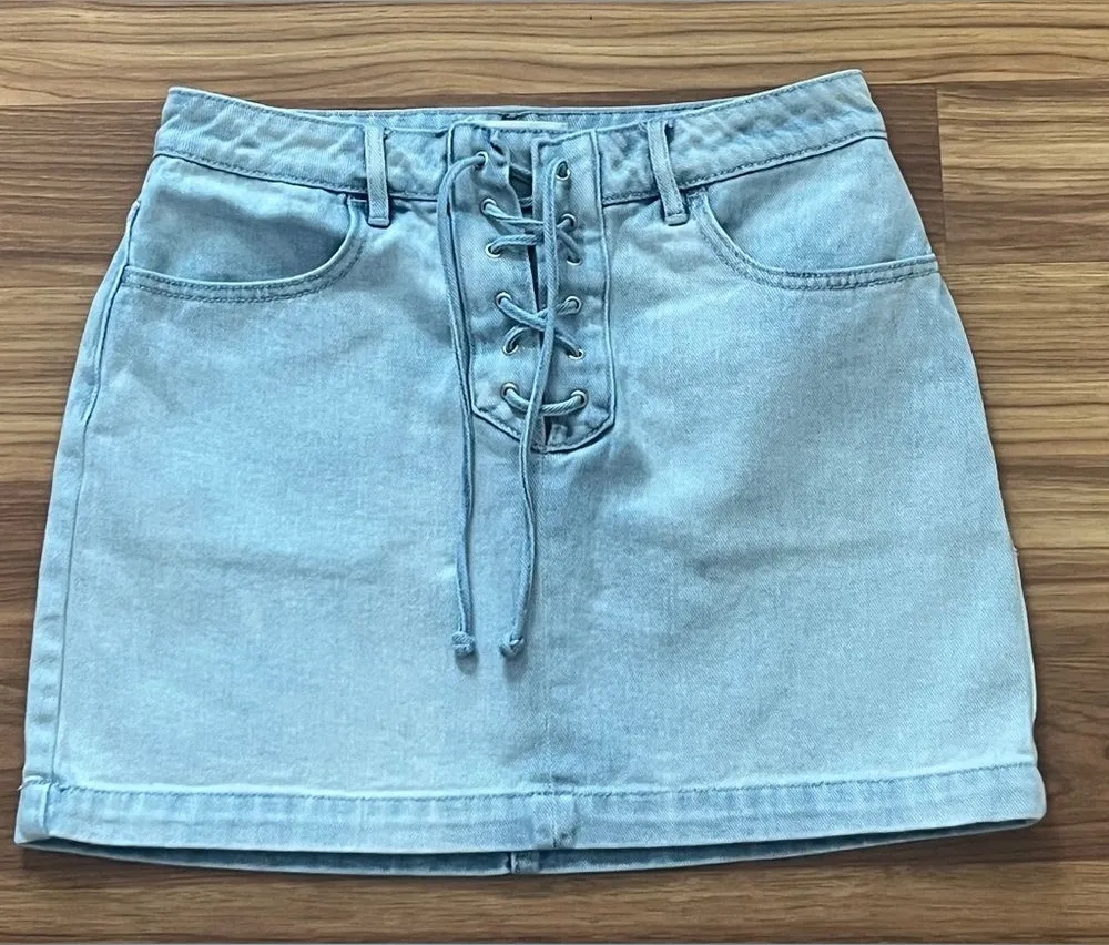 Pacsun denim skirt - light wash denim - has crisscross detail on the front -Size 25 Excellent Condit... Show more