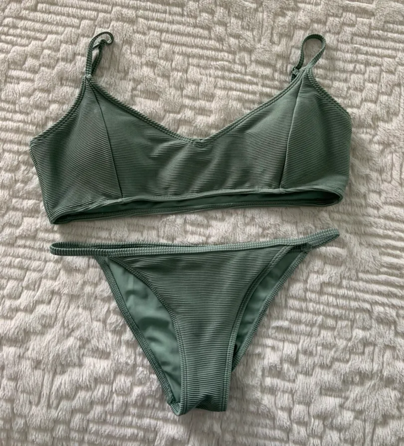 Swimsuit set from pacsun. Worn once. Light and removable padding. Top is a large and bottoms are siz... Show more